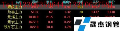 今日螺紋主力期貨漲45,收報4917,漲幅0.92%;熱卷主力漲67,收報5137,漲幅1.32%;焦煤主力漲21.5,收報3038,漲幅0.71%;焦炭主力漲8,收報3677.5,漲幅0.22%;鐵礦石主力漲30,收報822,漲幅3.79%。
